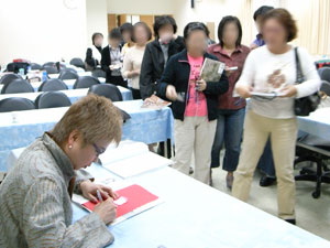 講習会の最後には斉藤にサインを求める長い列がすべての会場でできていました |
