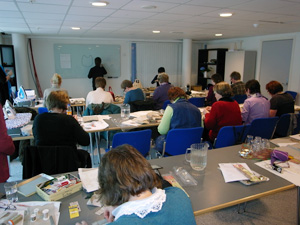 | 講習会の様子です。斉藤の説明中はおしゃべりすることは一切なくみなさんとても熱心にノートを取っていました。ミシンが主流のノルウェーでは細い針を使ってのぐし縫いが新鮮だったようです。 |
