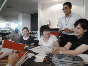 到着後すぐにホテルで打ち合わせ。中国語に翻訳された書籍にサインをします |